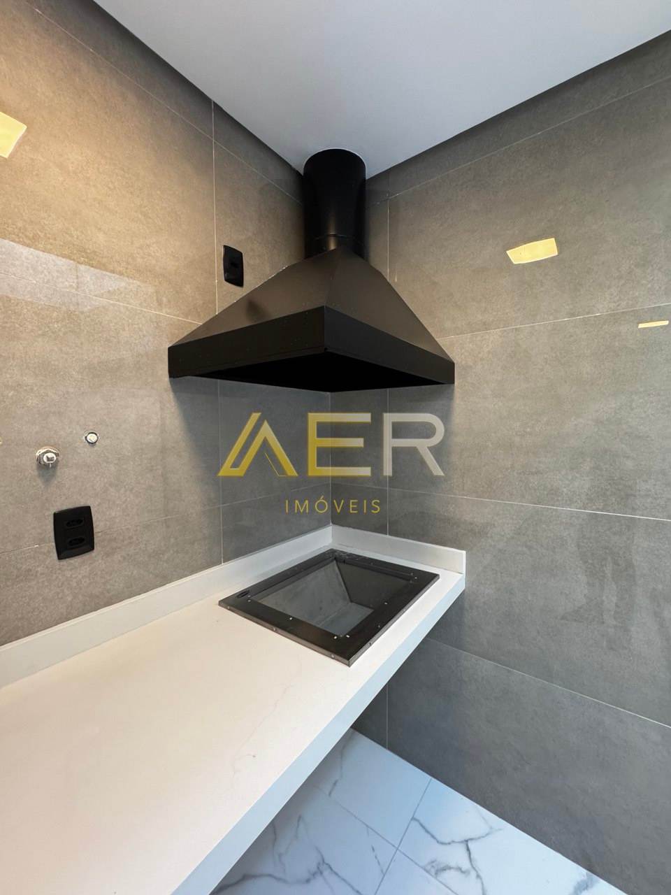 Espaço gourmet com churrasqueira embutida e pia de apoio